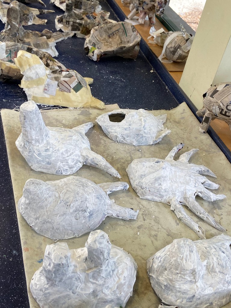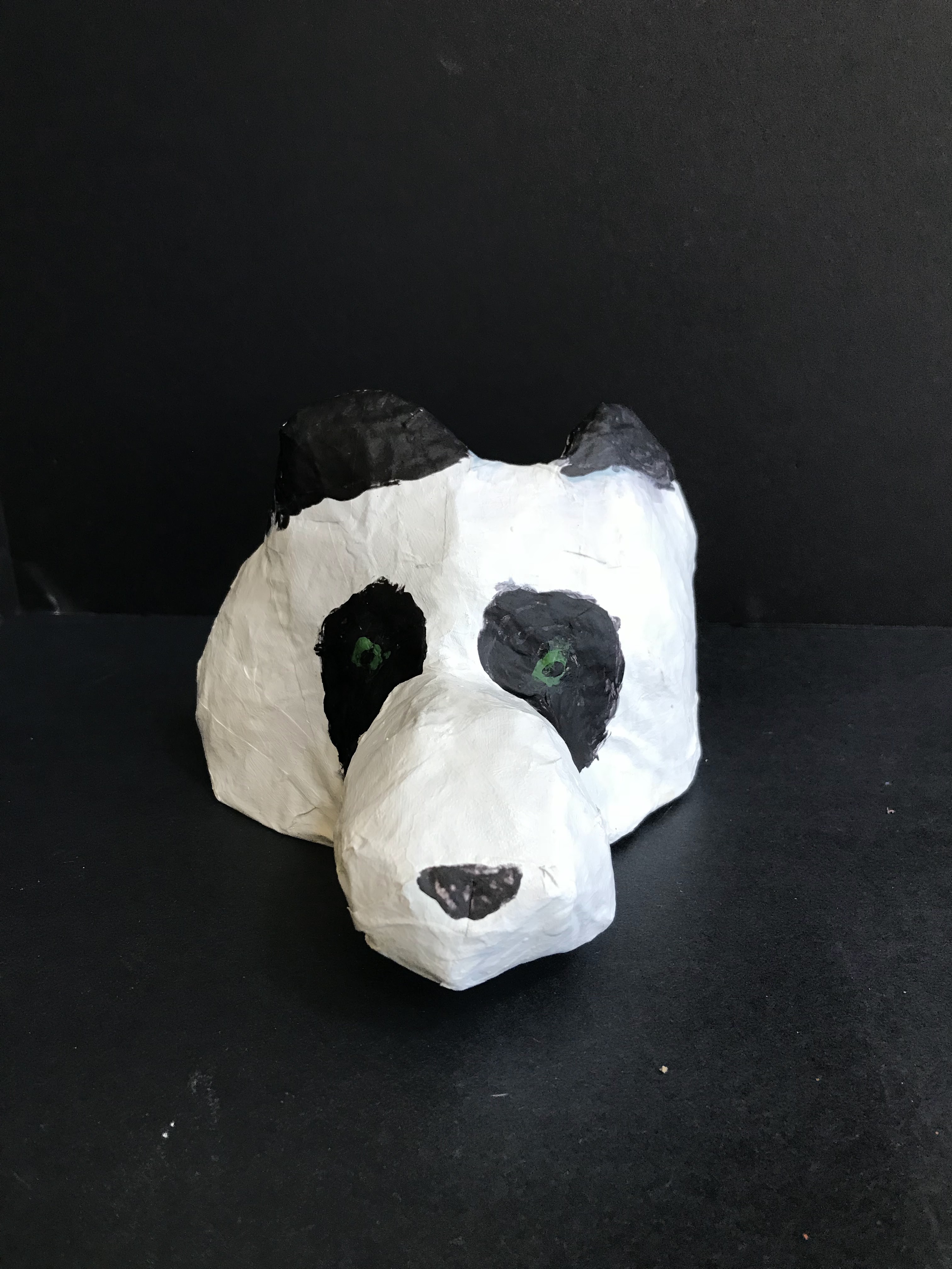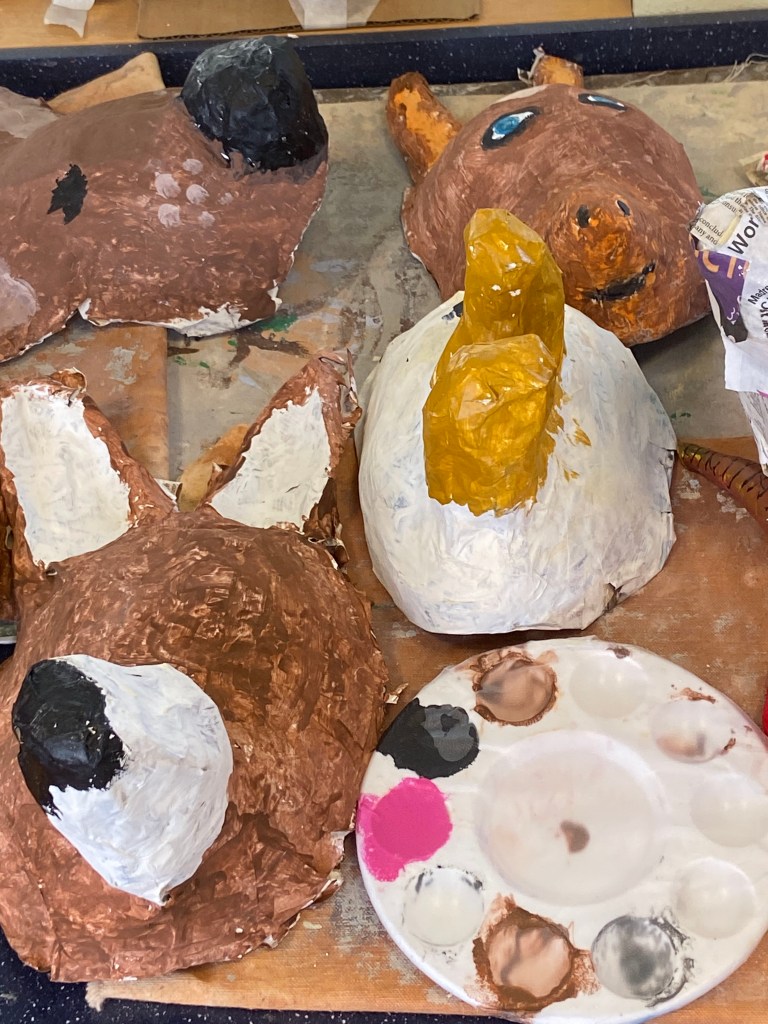 When the masks are complete, students will add the features of their animal using newspaper, tin foil, wire and covering the entire mask with masking tape. This will allow the students to paper mache their mask. Without the tape, the plaster can get soggy from the paper mache so be sure to have them completely cover their plaster. Completed paper mache masks will then be painted white to create an even base to paint the colors of their animal.