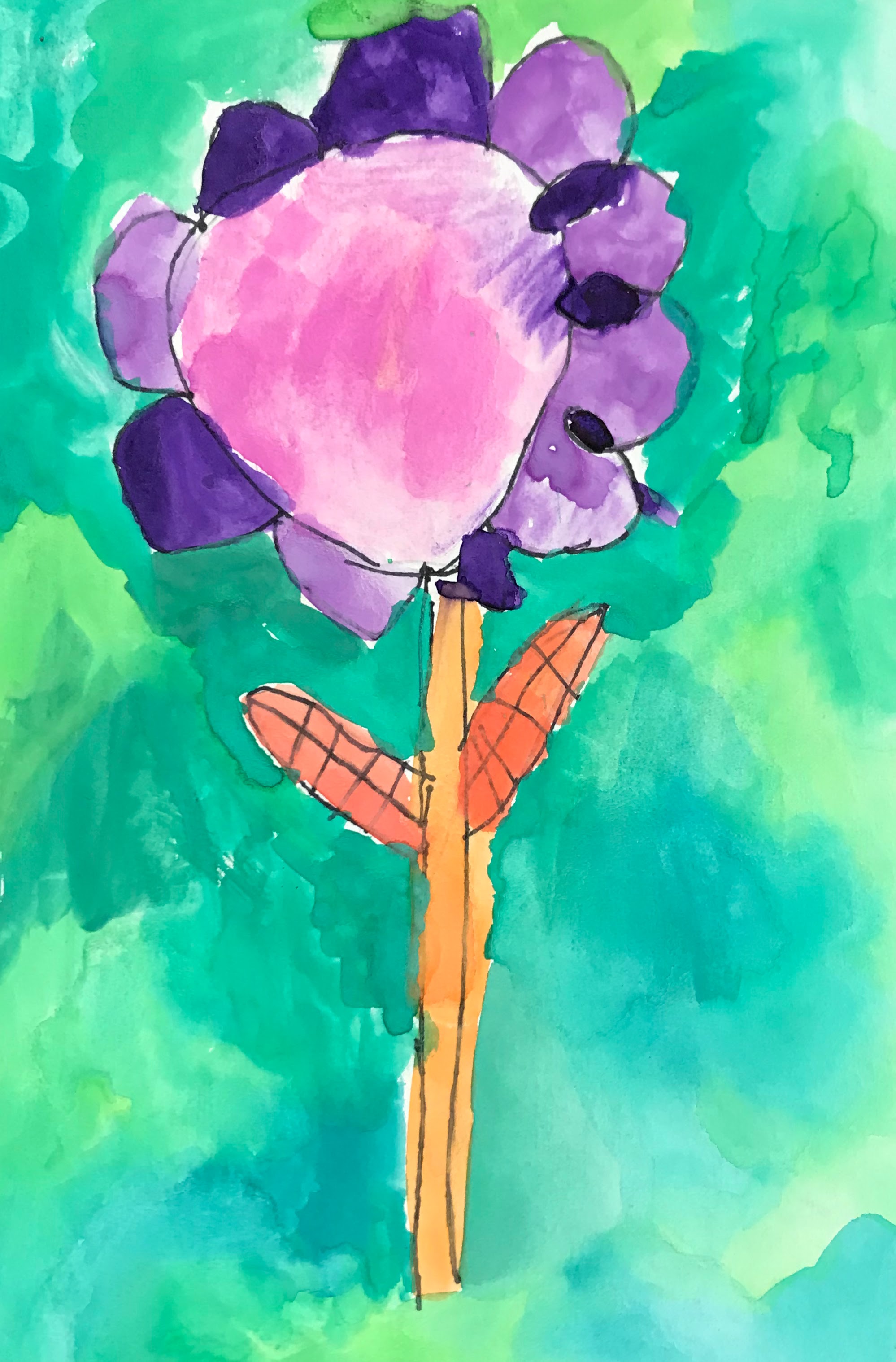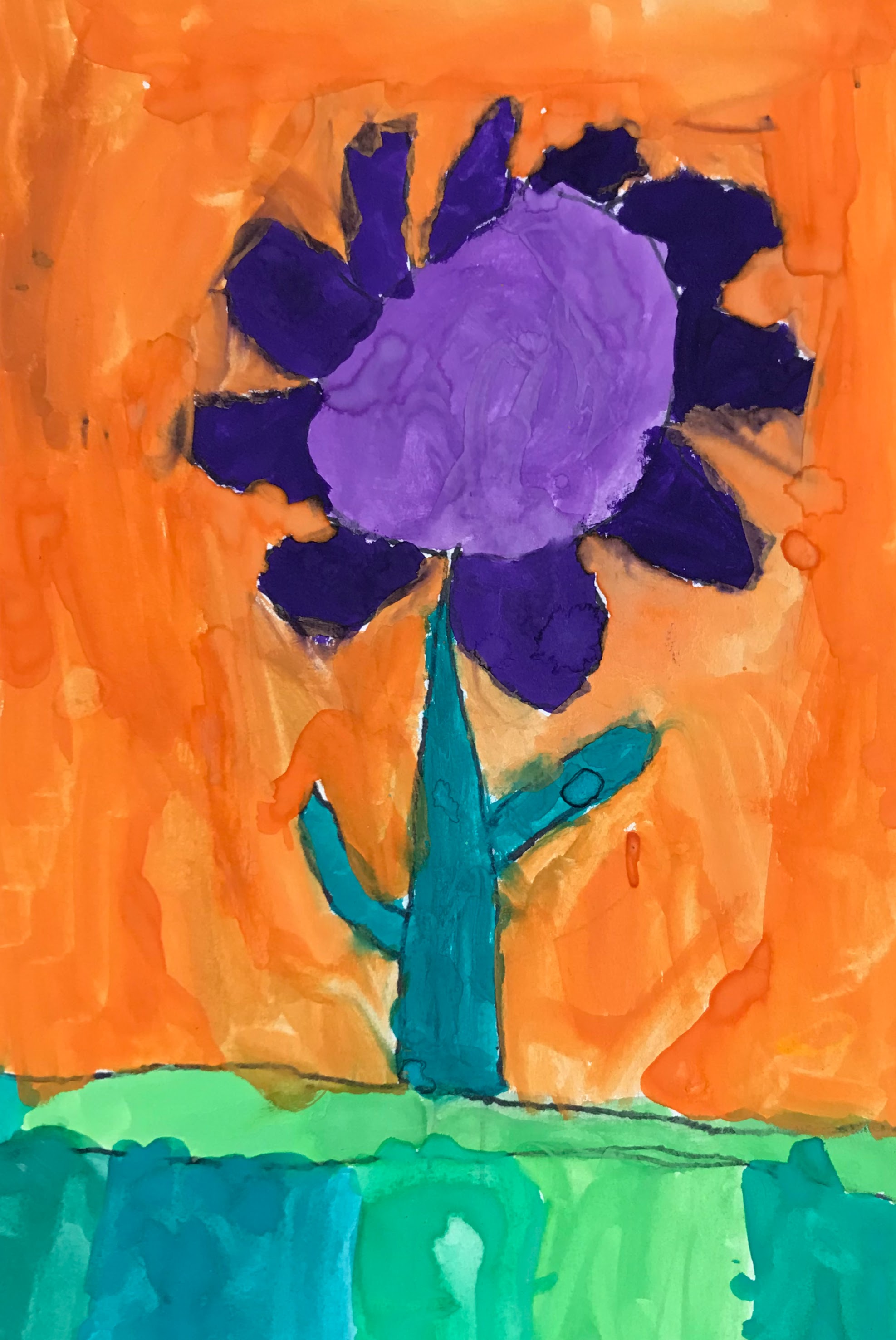 - Students will paint their image using the secondary colors, purple, orange, and green. They will choose one section to color each color, the flowers and vase, the background, and the tabletop. For example, a student might choose purple for the flowers and vase, orange for the background, and green for the tabletop.