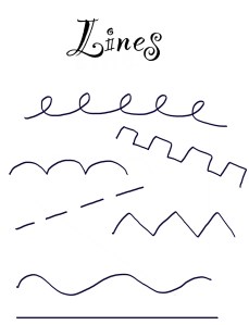 I like to introduce lines in 2 ways. First I have the students either tell me examples or come up to the board to draw different examples of lines so that we have an arsenal of ideas for our project.