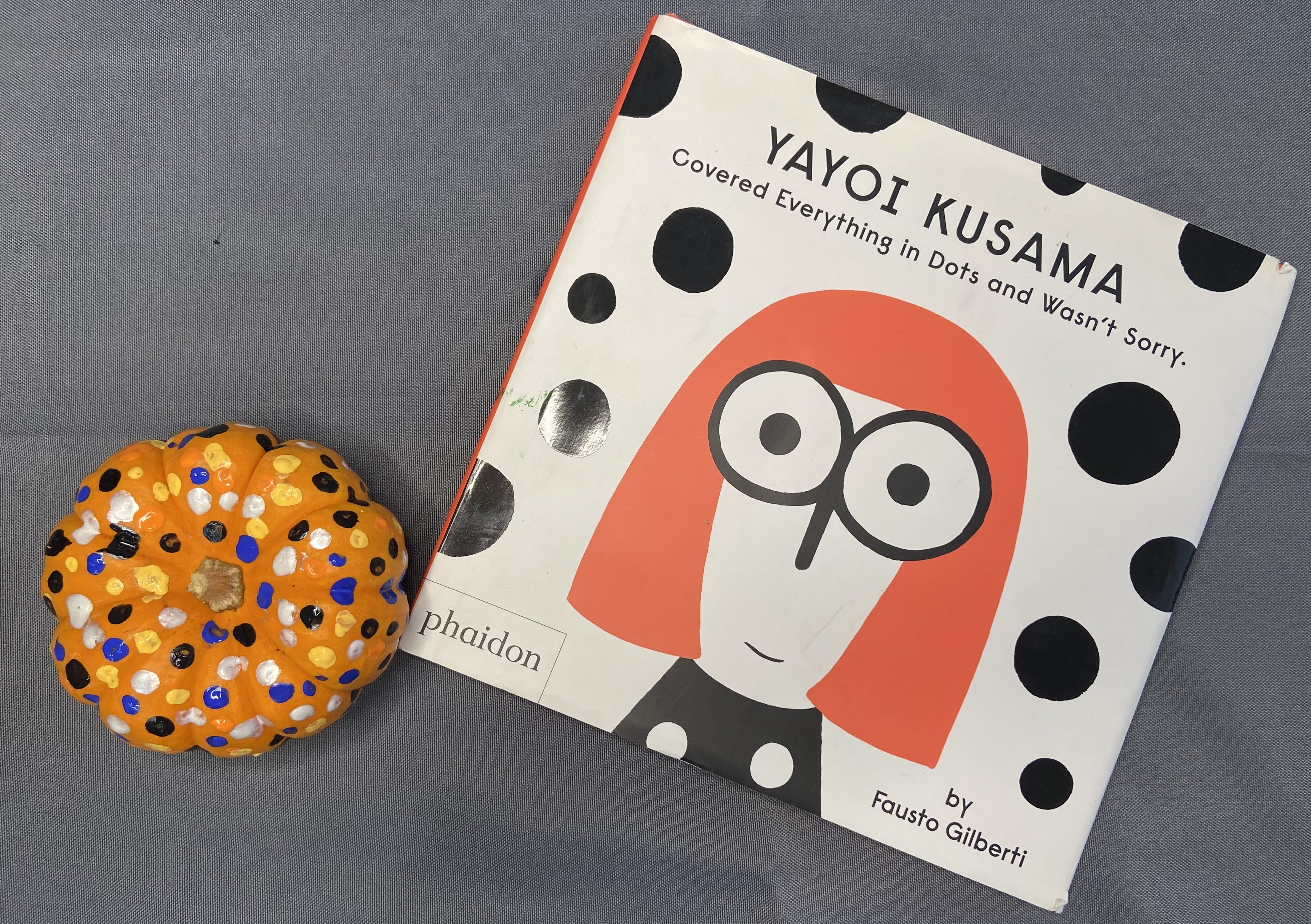 One of my kids favorite books to read is Yayoi Kusama Covered Everything in Dots and Wasn’t Sorry. The book, written by Fatsu Gilberti, gives a great background on the artist with fun cartoon illustrations making this book a resource for elementary age kids. While reading, the author discusses Yayoi’s love of pumpkins. While I was making this project, it happened to be fall and pumpkins were readily available. If you do not have the book, you can either purchase it through this link or you can watch my video below where I read the book aloud and then give the lesson that is described in this post.