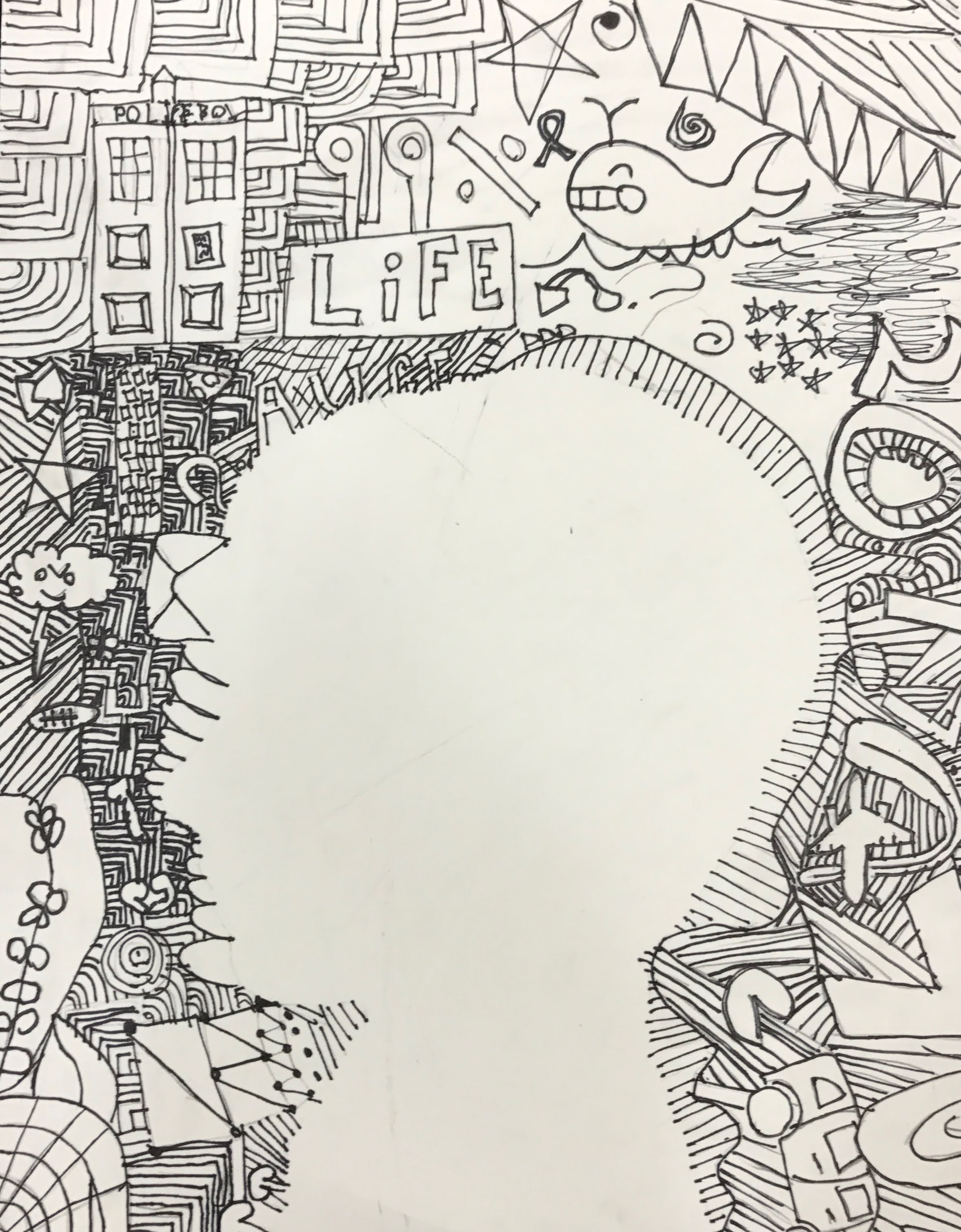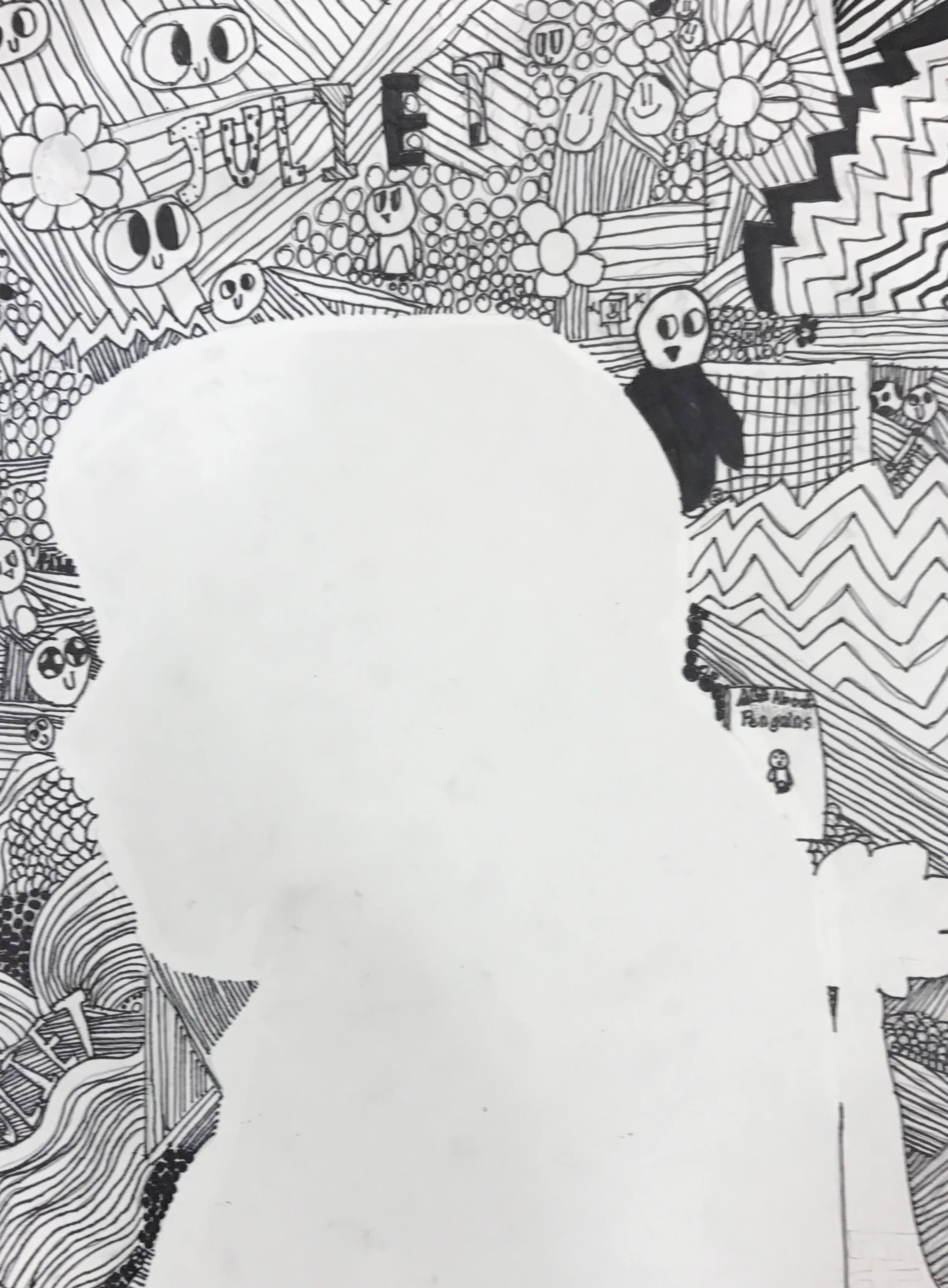 - Students start creating designs, drawings, patterns, or text in the background. I recommend having this be done in pencil first, however, this can also be done in sharpie (but mistakes cannot be undone). DO NOT TRACE THE DRAWING. The designs around the drawing make it stand out. Outlining it defeats the purpose of the project.