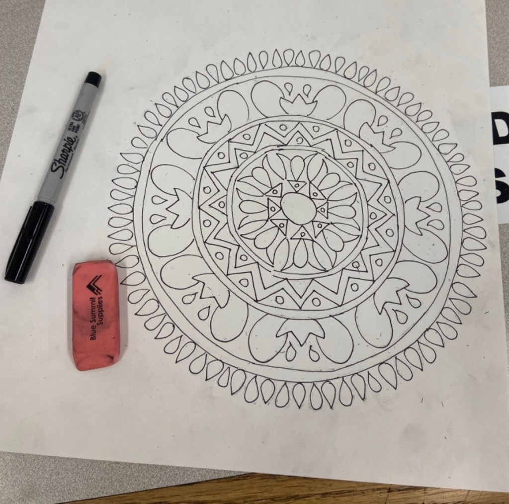 - Trace the completed design in ultra thin sharpie and erase any pencil marks left behind. At this stage, students should make sure that their sections are touching. They can always add sharpie wherever there are gaps.