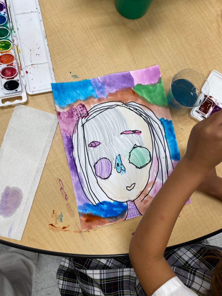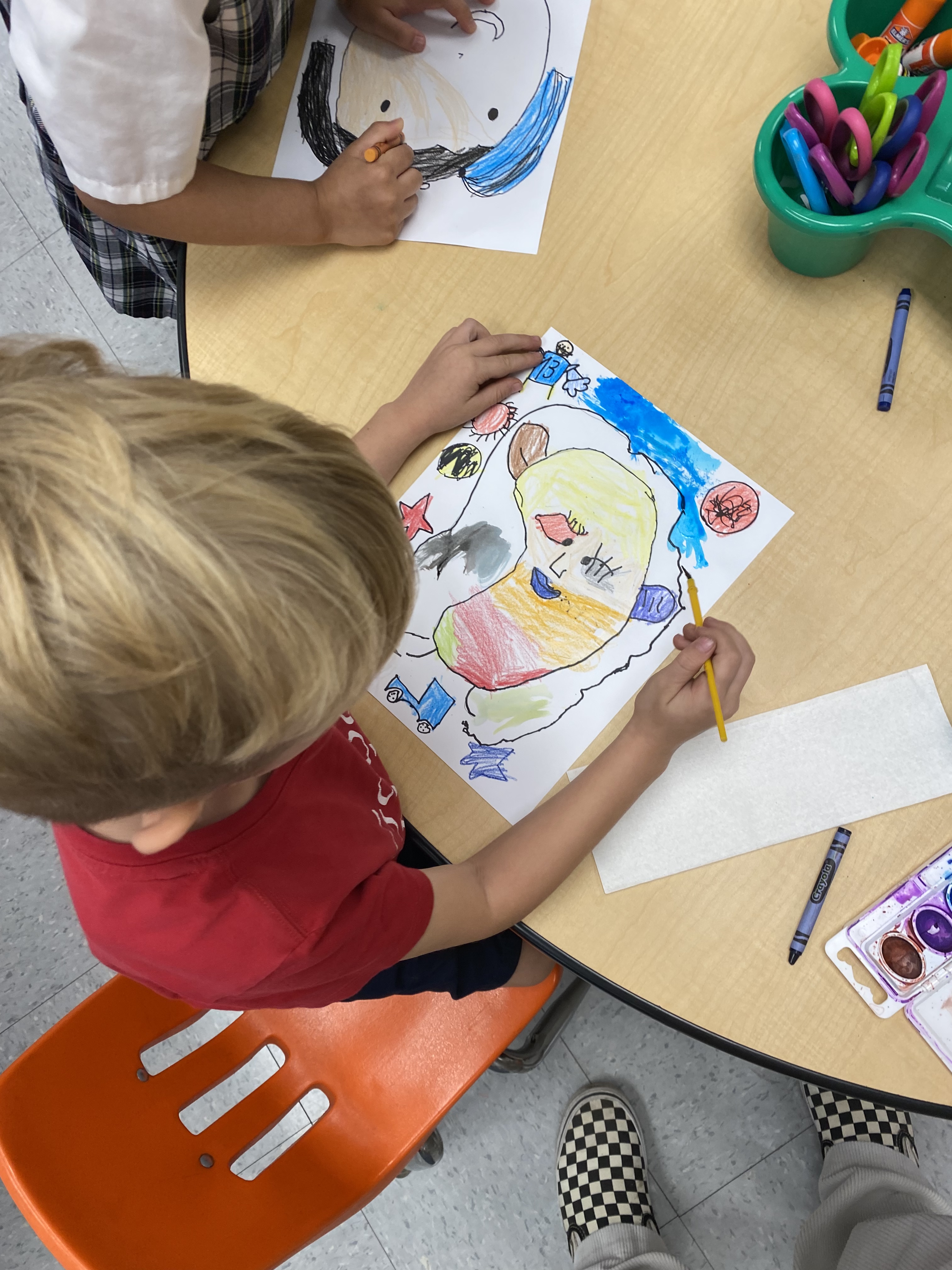 - I have found that using colored pencil to finish the portrait and watercolors in the background works the best, but all watercolor works too. I would avoid using just colored pencil because it can become difficult for the kinders to color their whole image. Watercolors are much easier.