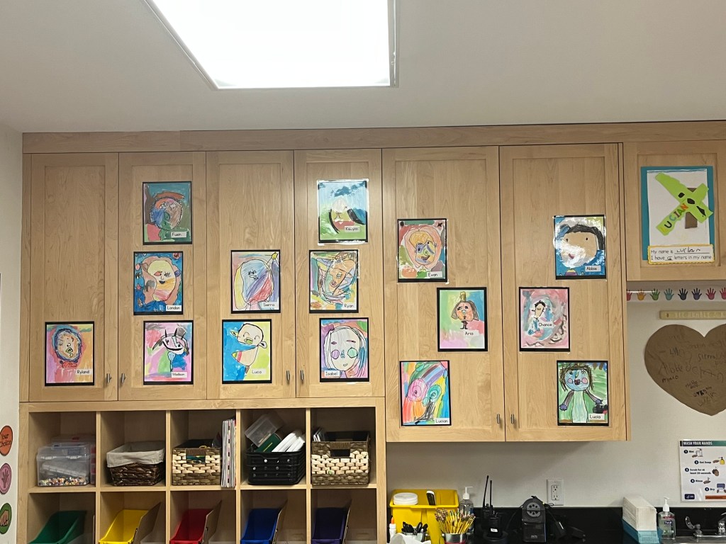 These artworks come out so different showing each kinders individual personality. Itโs a great lesson to do at the beginning of the year and makes awesome wall art for back to school night!