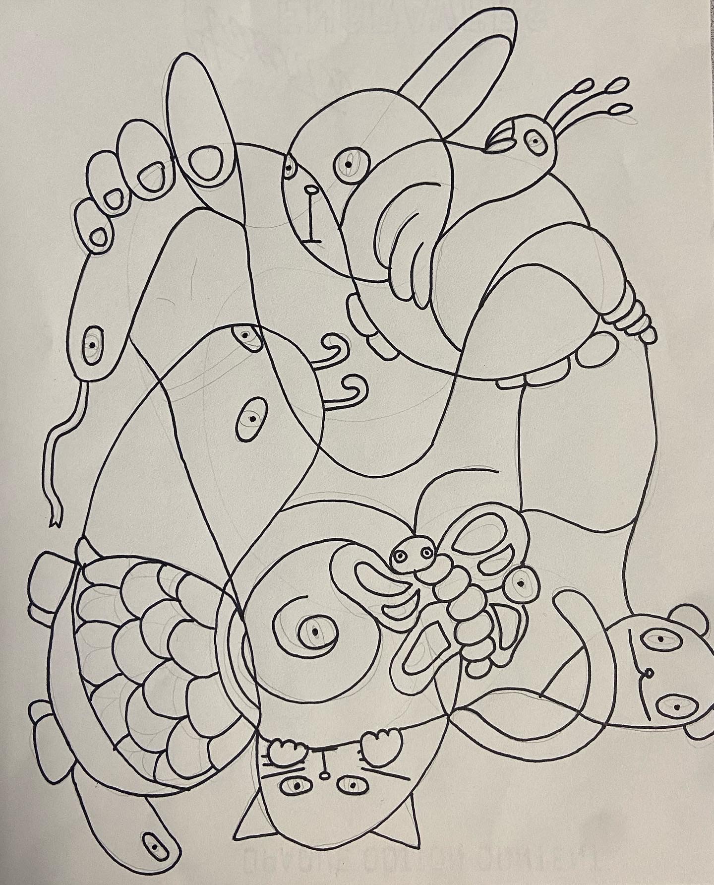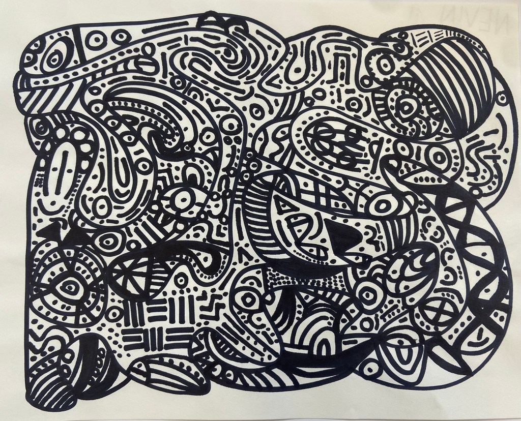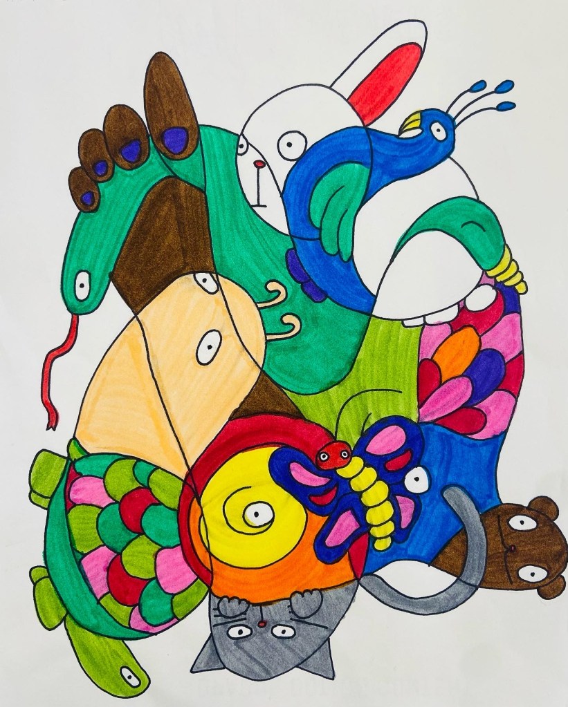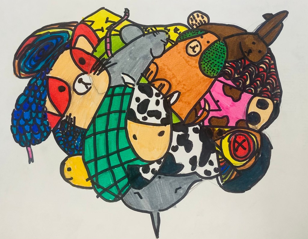 - When their initial doodle is done, they can begin adding characters, animals, words, or patterns in the different section. They can use multiple sections for a drawing, they do not have to make a drawing in each individual section. I like to equate this step to seeing images in clouds. What can their imagination come up with. They could come up with a theme like animals or food, but this in not required.