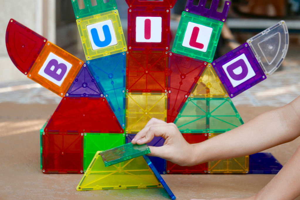 Legos, connector straws, magnetiles