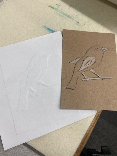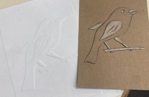 - Create the plate: using thin cardboard or old cereal boxes, the students create the image using at least three layers. The plate itself is layer one, so the eye of my bird in the example below is actually layer one because I cut away from layer 2, which is the actual bird. Layer 3 is the bird wing and the beak because it sits on top of the bird. Give your students one piece of cardboard for the plate and another to cut from. I think using exacto knives is easier for making cleaner plates, but does have the danger of injuring a student.