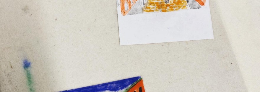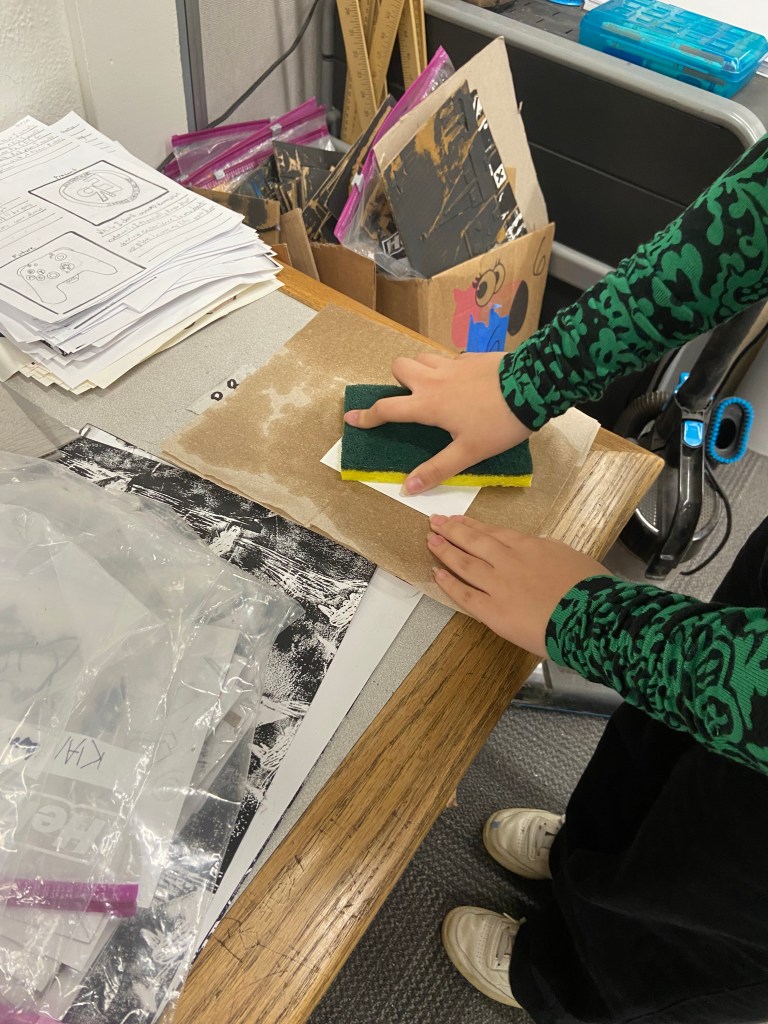 - Printing: the paper used should be damp, but not too damp that the watercolor bleeds. The press also needs to be tight enough to print the image but not too tight to squish the paint out of the edges. This will take some practice and recommend doing some practice prints before printing student works. Place a paper towel on top of the plate to make sure the paint doesn’t bleed onto your pusher and catcher blankets.