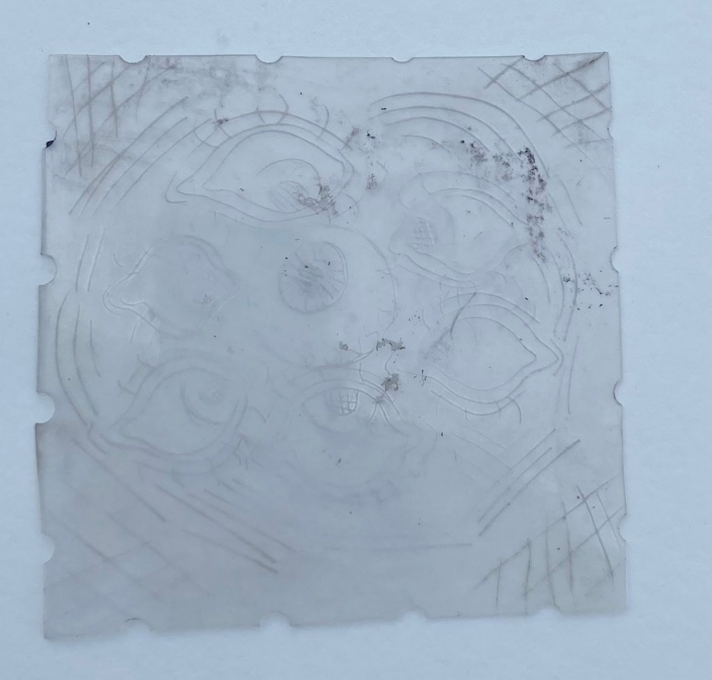 - When a draft has been chosen, the student can tape their plate on top of the draft. They then scratch into the plate tracing their design (intaglio process) Beware of scratching too light or too hard. Too light will create prints missing details and too hard will bend the plate and make the printing process difficult.