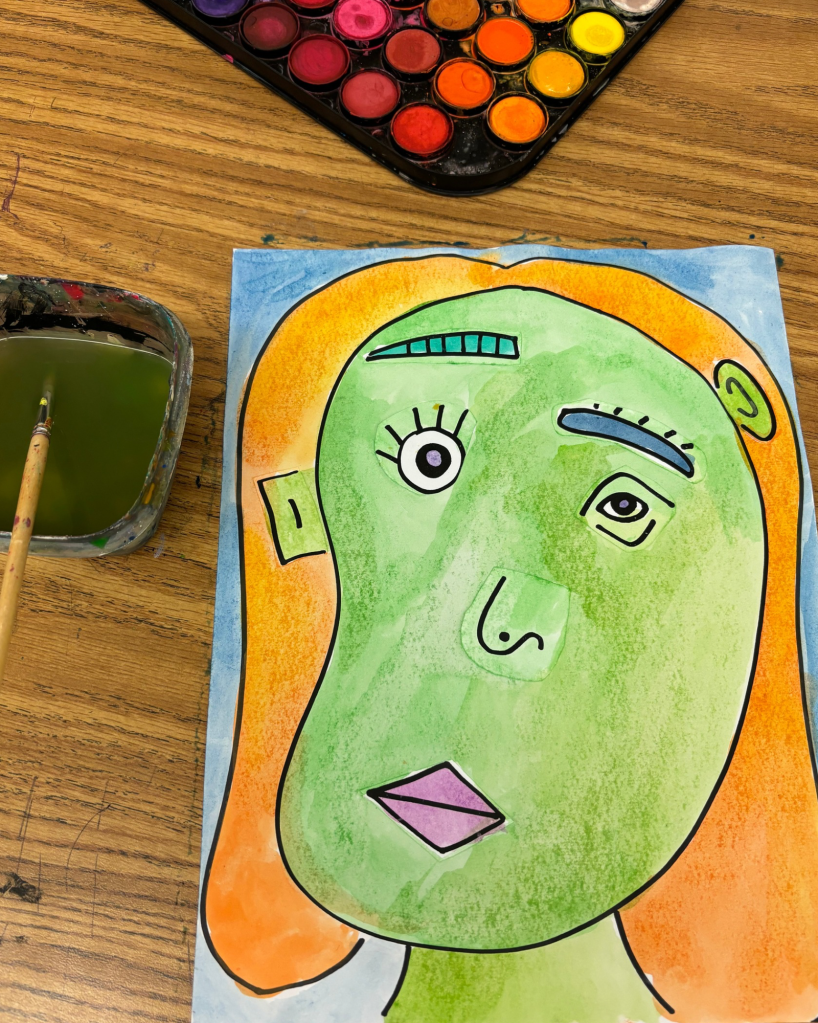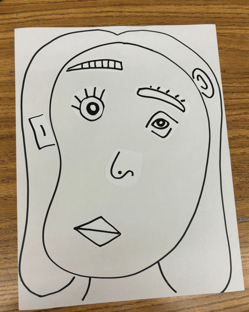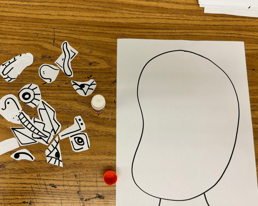 For these portraits, I used Picasso as inspiration. I use Picasso frequently when teaching younger students for I like to emphasize not needing things to look perfect. The goal is to make a portrait that emphasizes the abstract principles while also developing creativity, motor skills with cutting and gluing, and art skills through coloring.